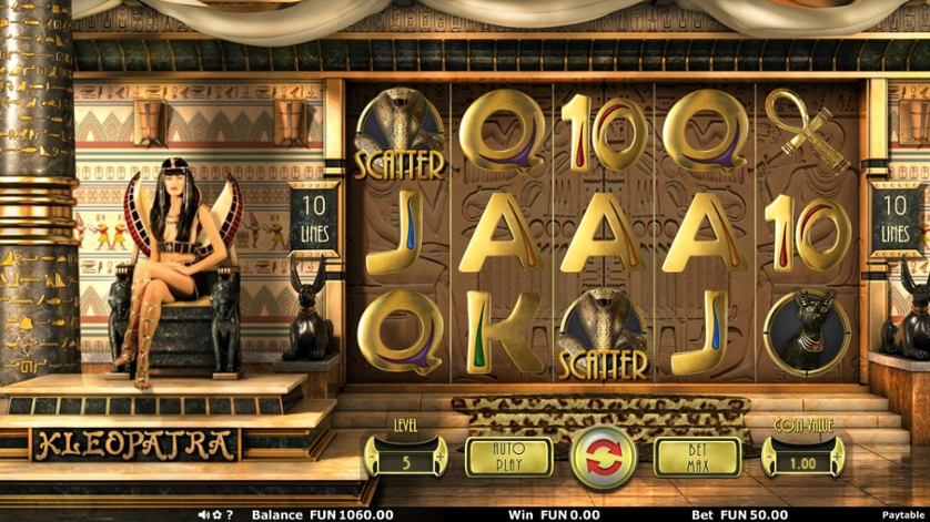 Kleopatra is a 5-reel slot with 10 lines, a bonus game, scatter multiplier and expanding wilds. In action, it proves to be an attractive looking game, with classic Egyptian music setting the scene and a game board on which everything is designed in gold. This isn’t the tacky sort of gold that festoons most Egyptian slots. This slot stands out in looks and personality.